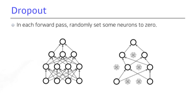 뉴럴네트워크의 weight의 일부를 ramdom하게 0으로 변환. 각각의 뉴런들이 robust한 feature를 잡을 수 있음. dropout ratio 가 0.5라면 50%가 0이 됨.