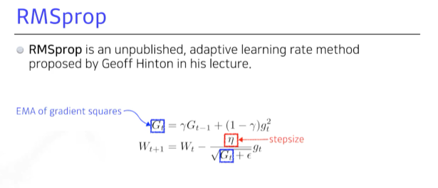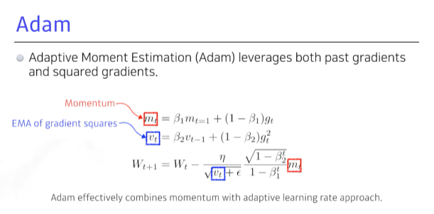 adagrad 보완. but 바꿀 수 있는 parameter가 많이 없어서 활용도는 낮음