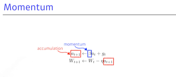 이전 배치의 정보를 활용해보자! B(하이퍼파라미터)가 모멘텀을 잡고, 다음번(t+1)때는 t때의 accumulation를 활용함. 한 번 흘러가는 gradient를 유지시켜주기때문에 왔다갔다 해도 일정 수준 보정해줌